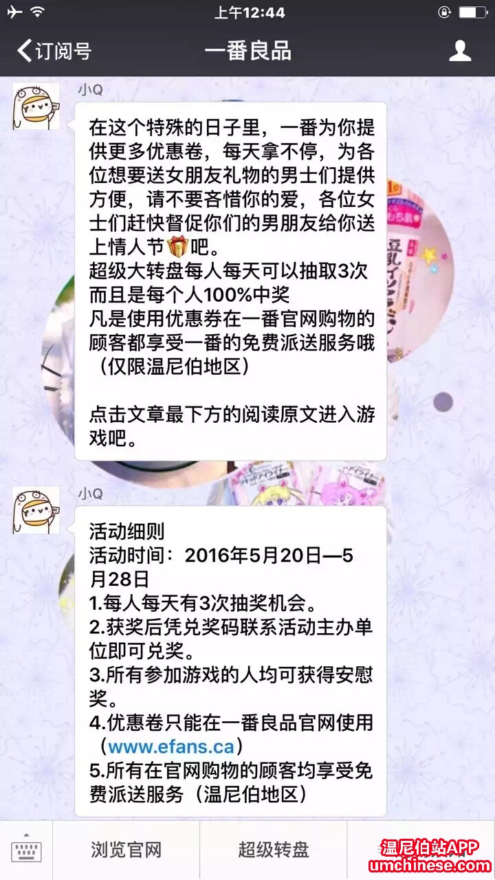 在这个桃心满天飞的日子里大家准备好接受来自一番良品的礼金!大!表!白!了吗?! 快快来扫描我们的公众二维码关注我们的公众号即可抽取奖金(15cad—2cad不等) 动动小手指~ 丰富礼品等你们哟~ 百分百中奖率等 ...