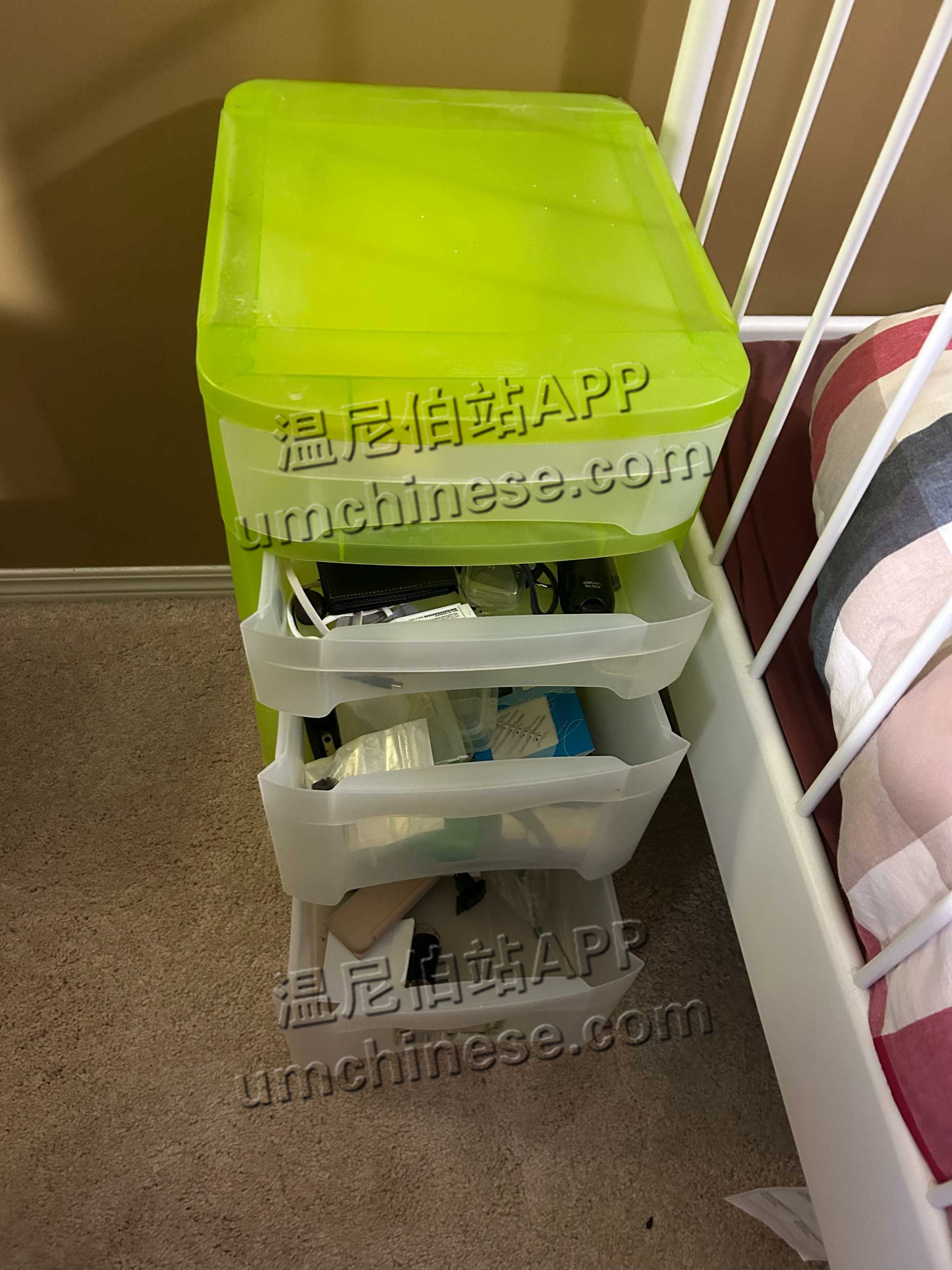 很实用的小柜子,四个抽屉能装很多东西,当床头柜非常不错,只要10刀 Weixing:Canada0678 或者发短信联系,778823 林六漆巴