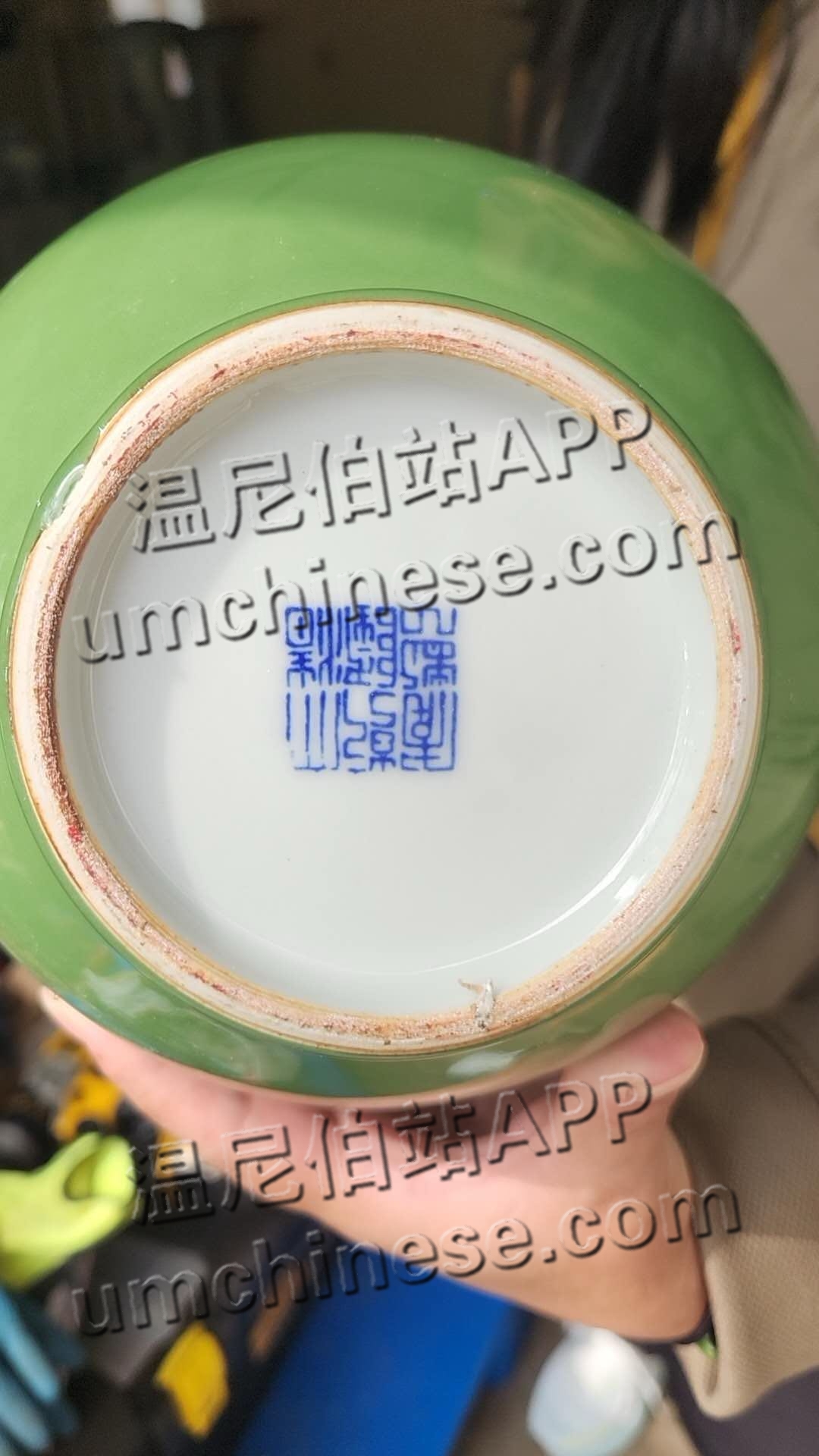 玉壶春瓶(或作"玉壶赏瓶")。判断依据: 1. 经典器型特征:细长颈、圆鼓腹、外撇口的三段式结构(图1、3); 2. 尺寸符合标准(标注高度30cm与实物比例吻合); 3. 绿色单色釉与器型搭配常见于民窑陈设器, ...