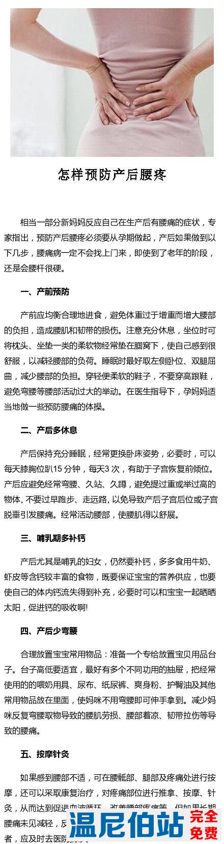 相当一部分新妈妈反应自己在生产后有腰痛的症状,专家指出,预防产后腰疼必须要从孕期做起,产后如果做到以下几步,腰痛病一定不会找上门来,即使到了老年的阶段,还是会腰杆很硬。那么今天就来和大家说说怎样预防产 ...