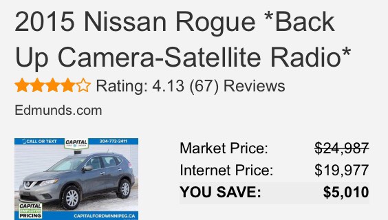 2015年的日产Rogue四驱SUV,几个月没买掉,已经下调了5千。只有2.8万公里、2.5升发动机、倒车影像。 想捡便宜的赶紧联系Jack 204-898-7766 555 Empress Street