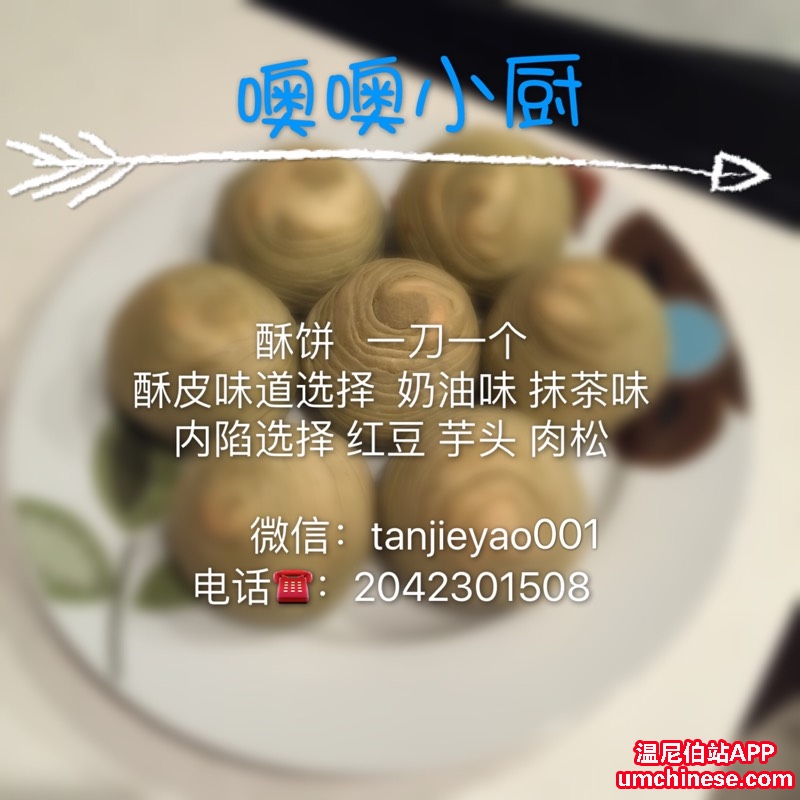 噢噢小厨为你带来酥到掉渣的酥饼 一刀一个.有芋头.红豆.肉松三种内陷任君选择 试业期间买五送一..欢迎大家来预定 微信号:tanjieyao001 电话204-2301508