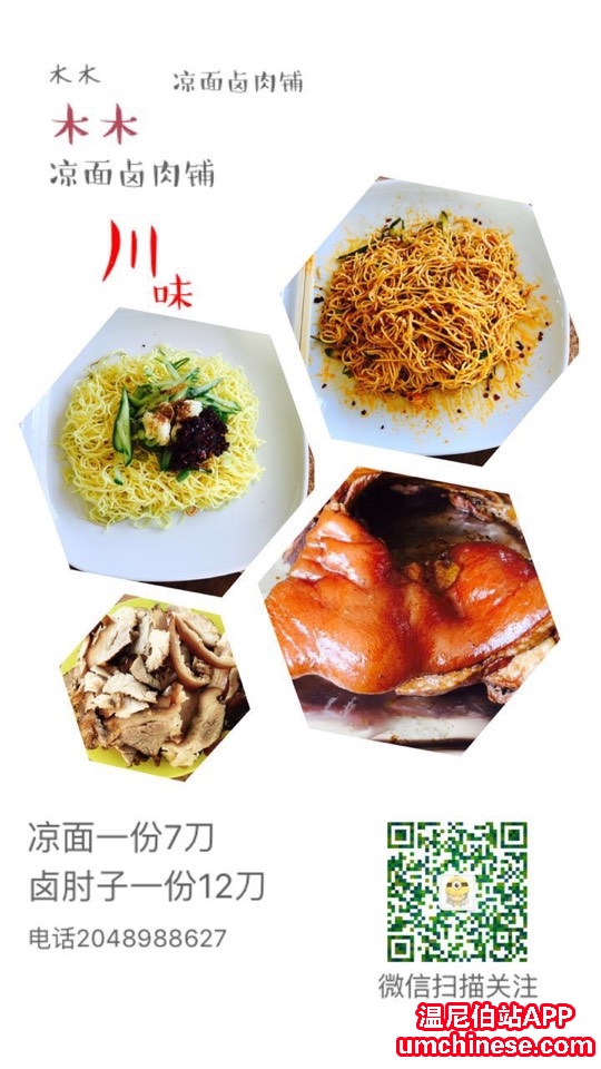 木木-凉面卤肉铺 凉面一份7刀 (提前45分钟预定) 卤肘子一份12刀 (提前2个小时预订) 满30刀南区免费送餐 不满30刀或市中心送餐费另加3刀 微信号:miumiujia15 联系电话: 204 898 8627