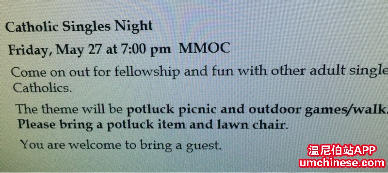 本周五5月27号晚上7:00在教堂Mary,Mother of the Church 有成人单身Potluck picnic 聚会!!![Rose][Rose][Rose],欢迎单身朋友们参加,说不定有意外惊喜等着你哦[Chuckle] 地址:85 Kirkbridge Dr